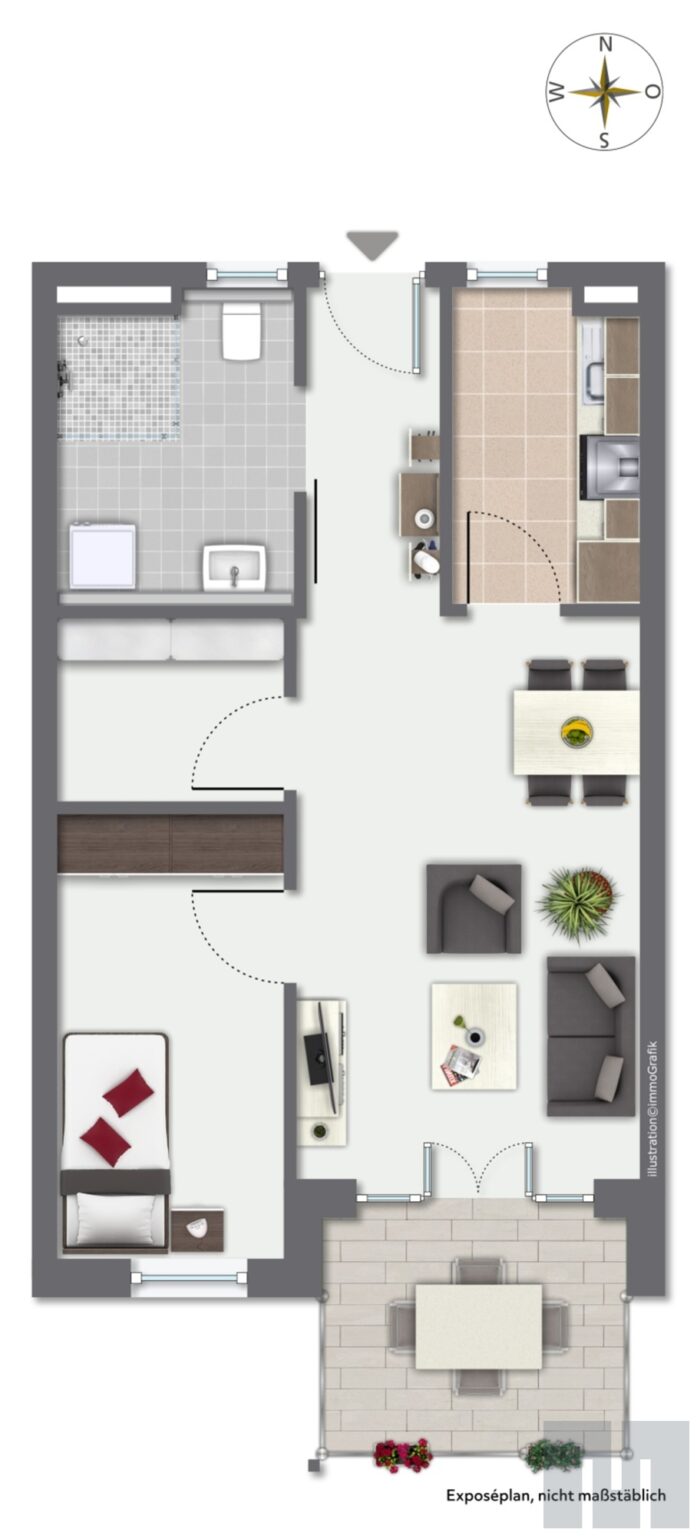 Beim Betreten der Wohnung gelangen Sie zunächst in den Flur mit Garderobenbereich, hier sind alle weiteren lichtdurchfluteten Räume erreichbar. Das Herzstück der Wohnung ist der offene Wohn- und Essbereich mit einem schwellenlosen Zugang auf den sonnige Südbalkon. Das Schlafzimmer und der Abstellraum sind vom Wohn- und Essbereich zugänglich. Das geräumige Tageslichtbadezimmer ist mit einer bodengleichen Dusche, einem Waschbecken, einem WC und einem Waschmaschinenanschluss ausgestattet.